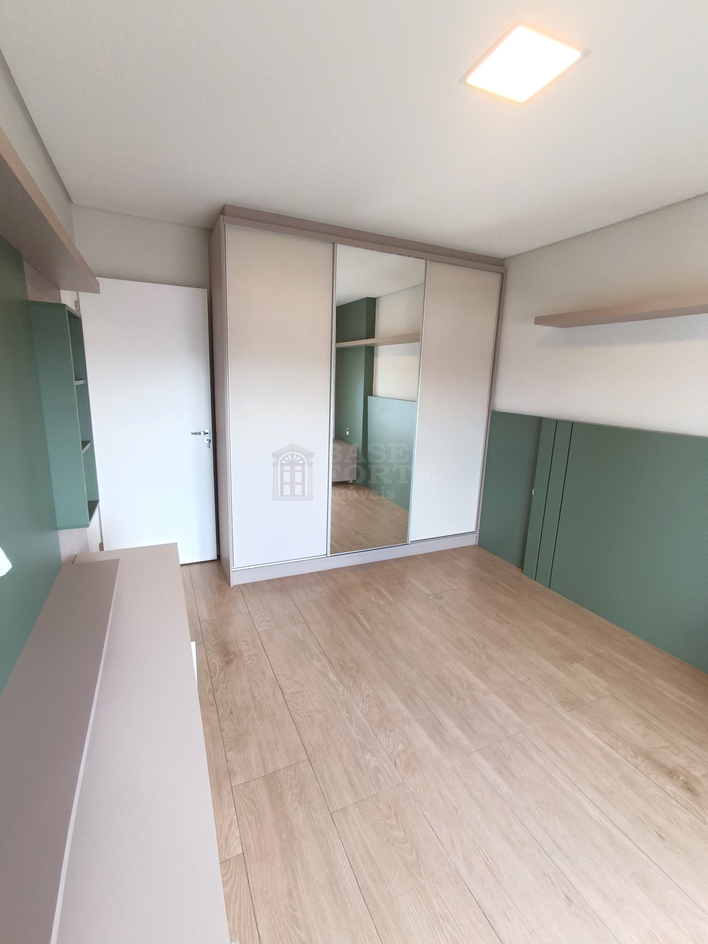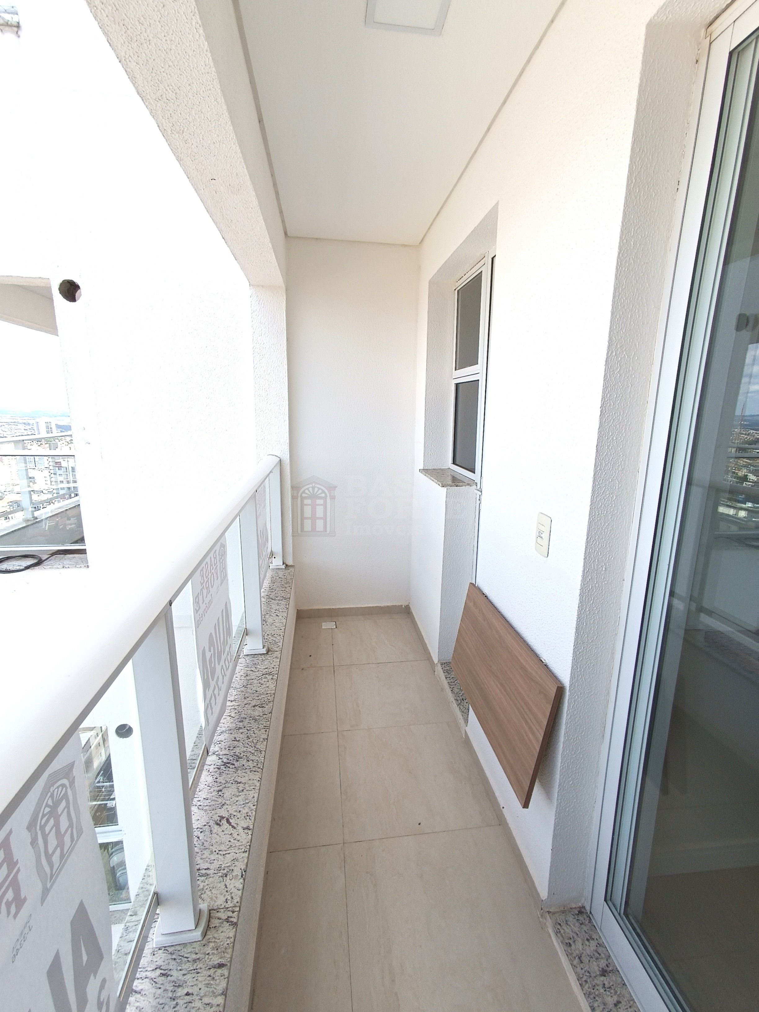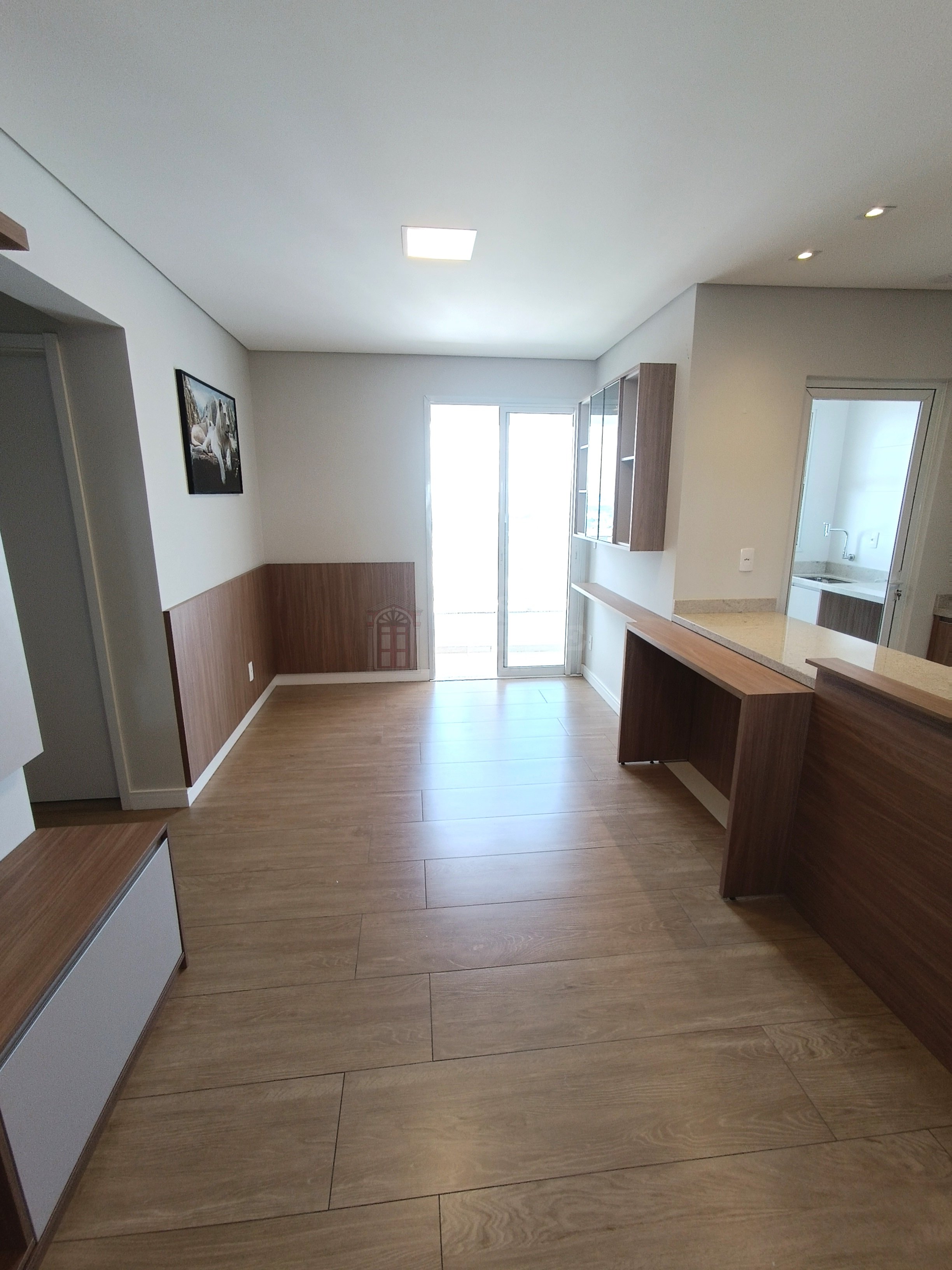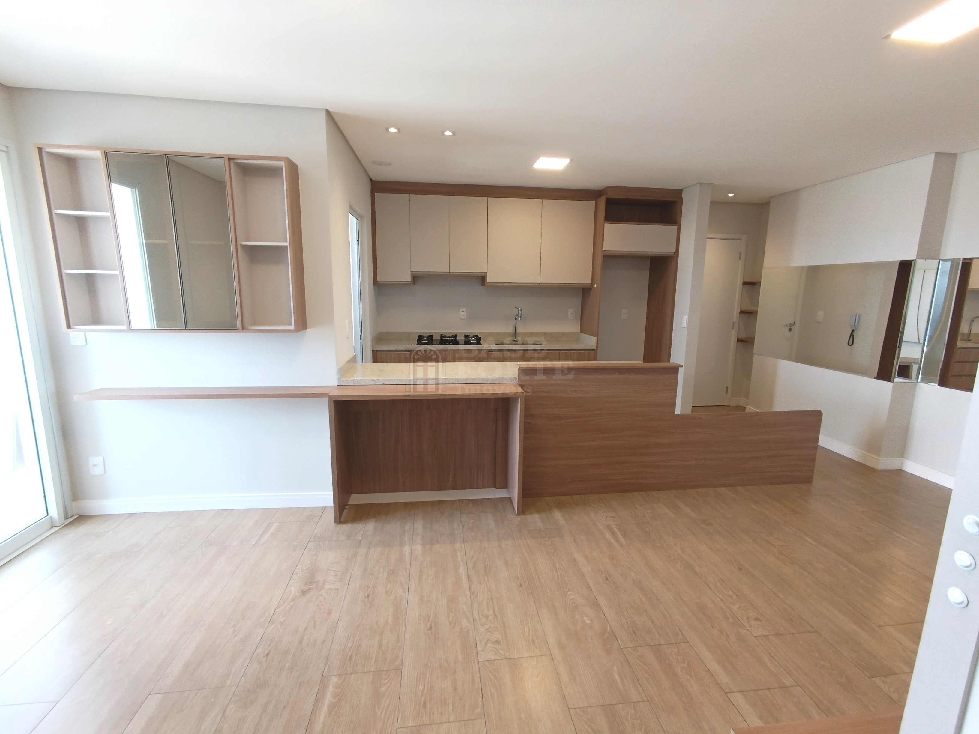Apartamento contendo 2 quartos (sendo uma suíte), sala de estar e jantar integradas, cozinha (com armários), banheiro social com armários, área de serviço, área gourmet com churrasqueira e uma vaga de garagem.