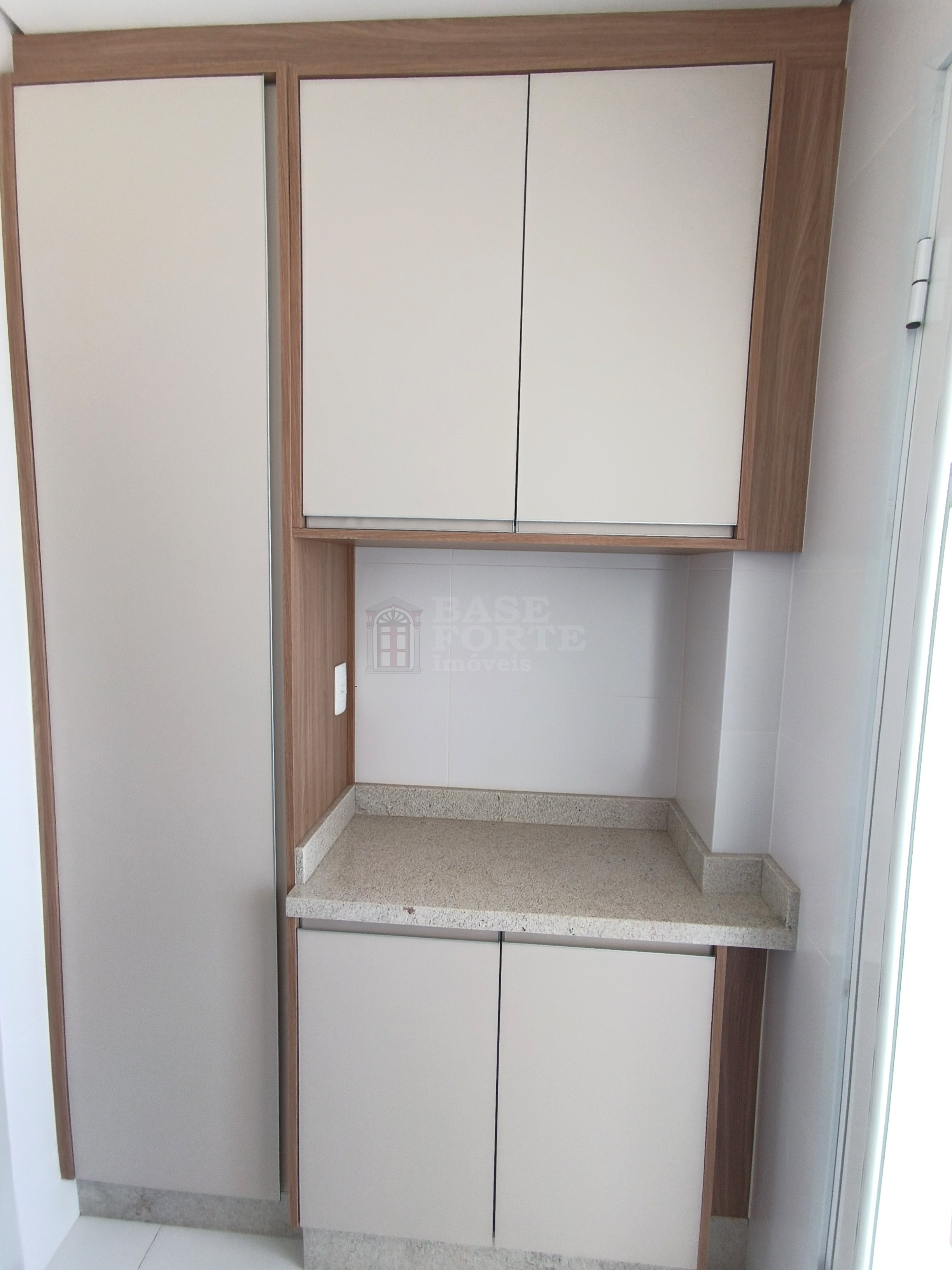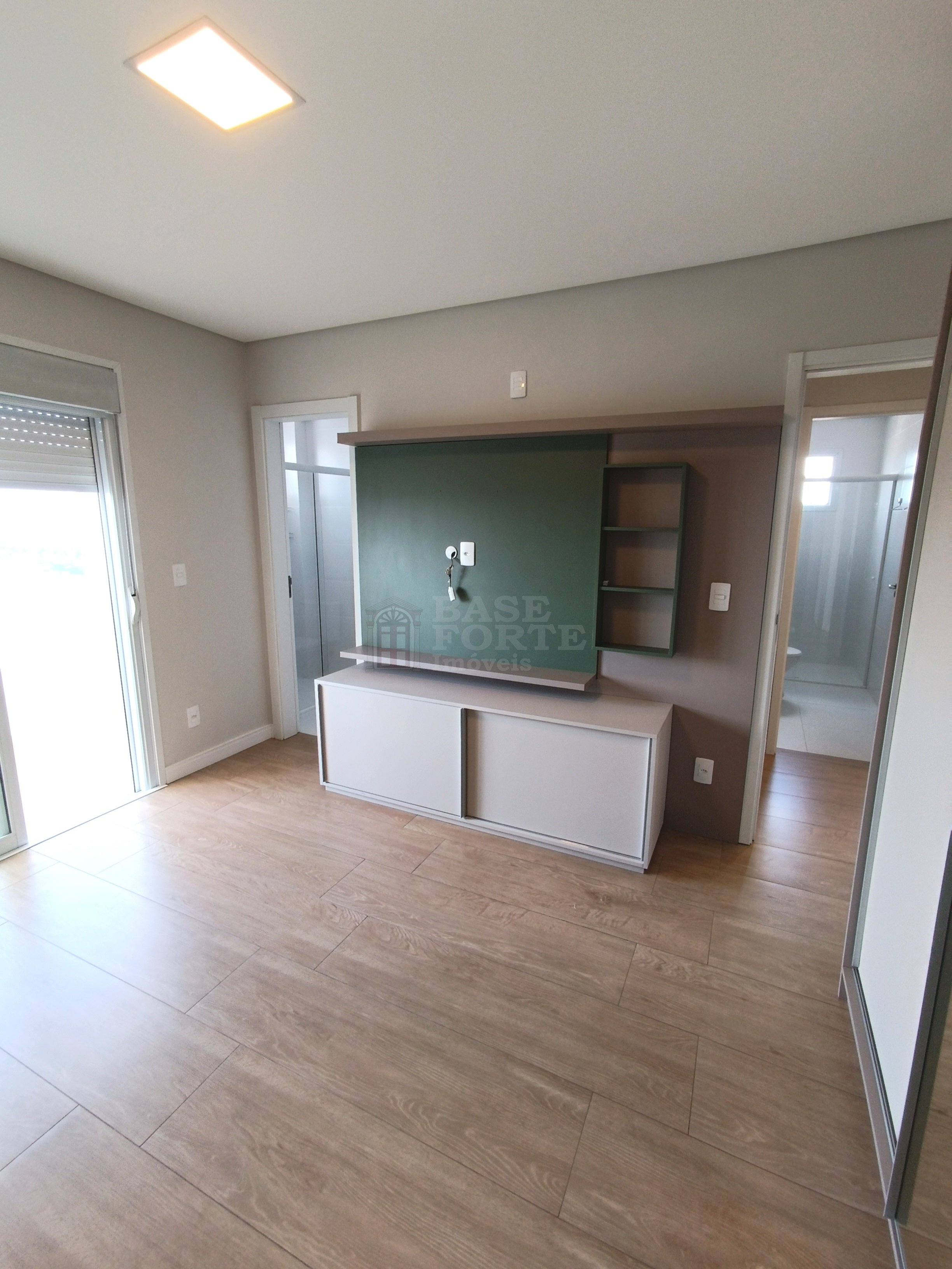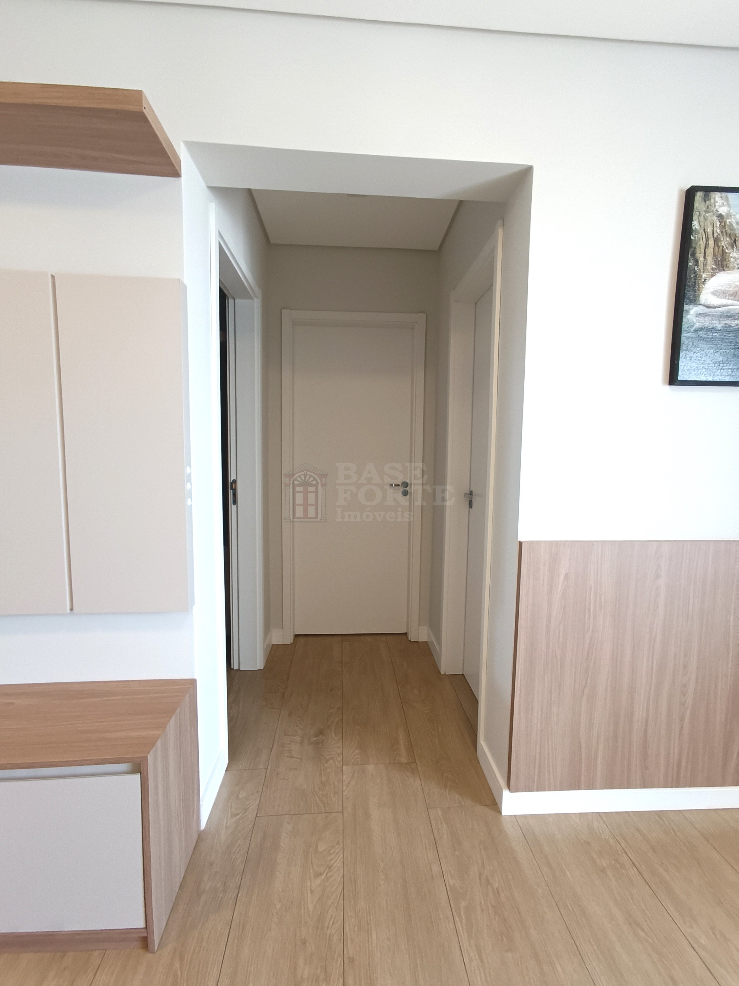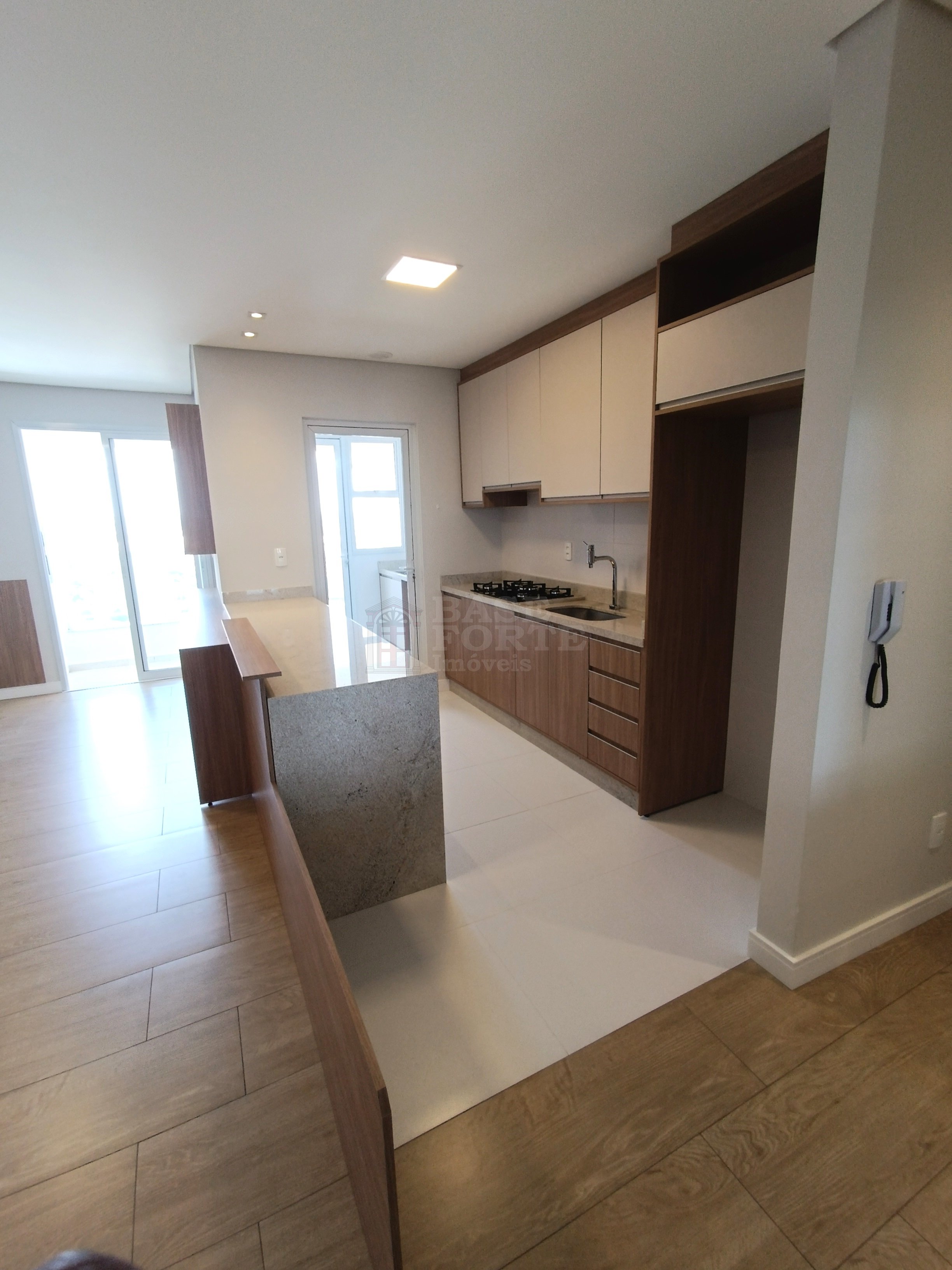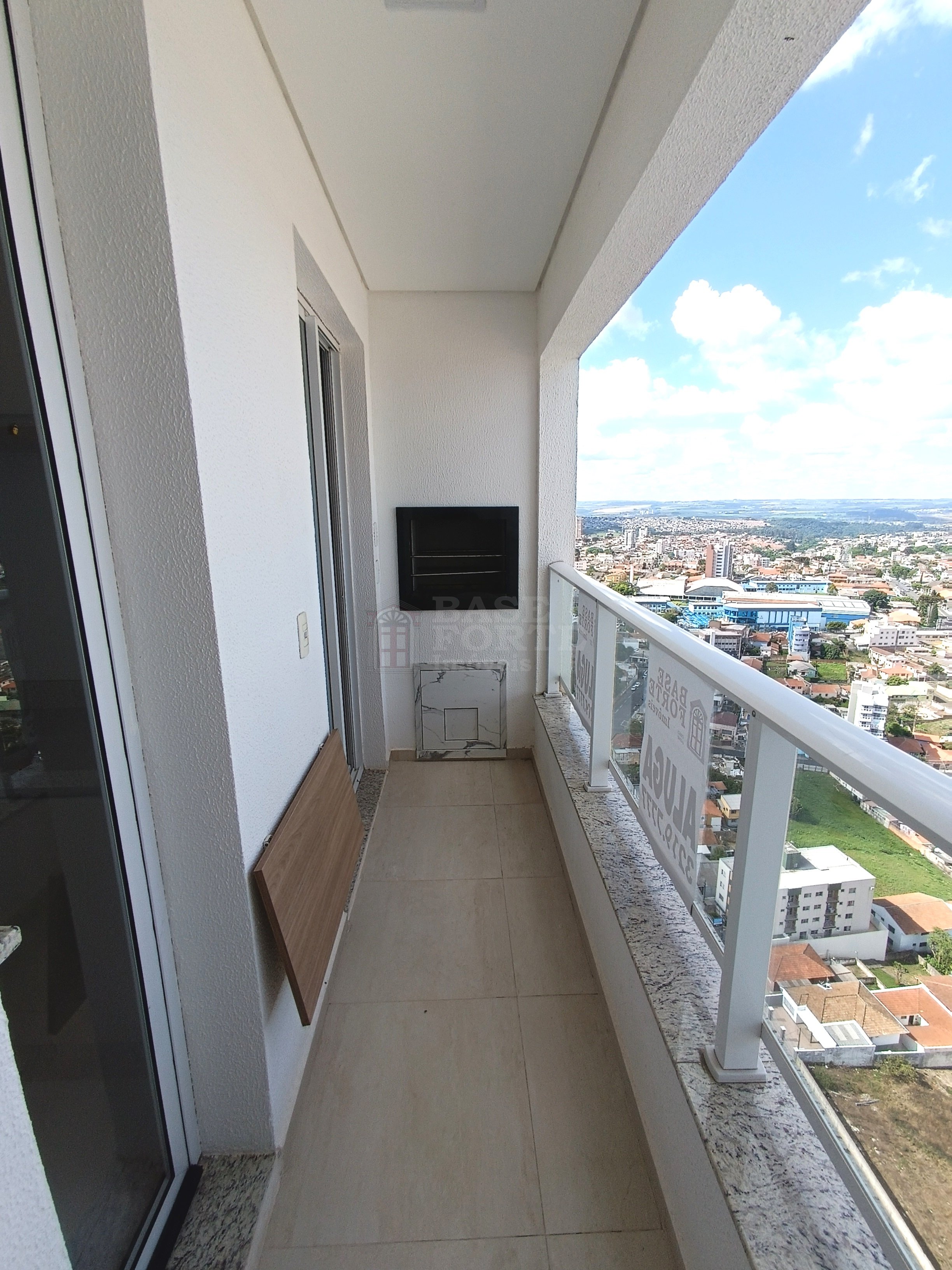 Apartamento contendo 2 quartos (sendo uma suíte), sala de estar e jantar integradas, cozinha (com armários), banheiro social com armários, área de serviço, área gourmet com churrasqueira e uma vaga de garagem.