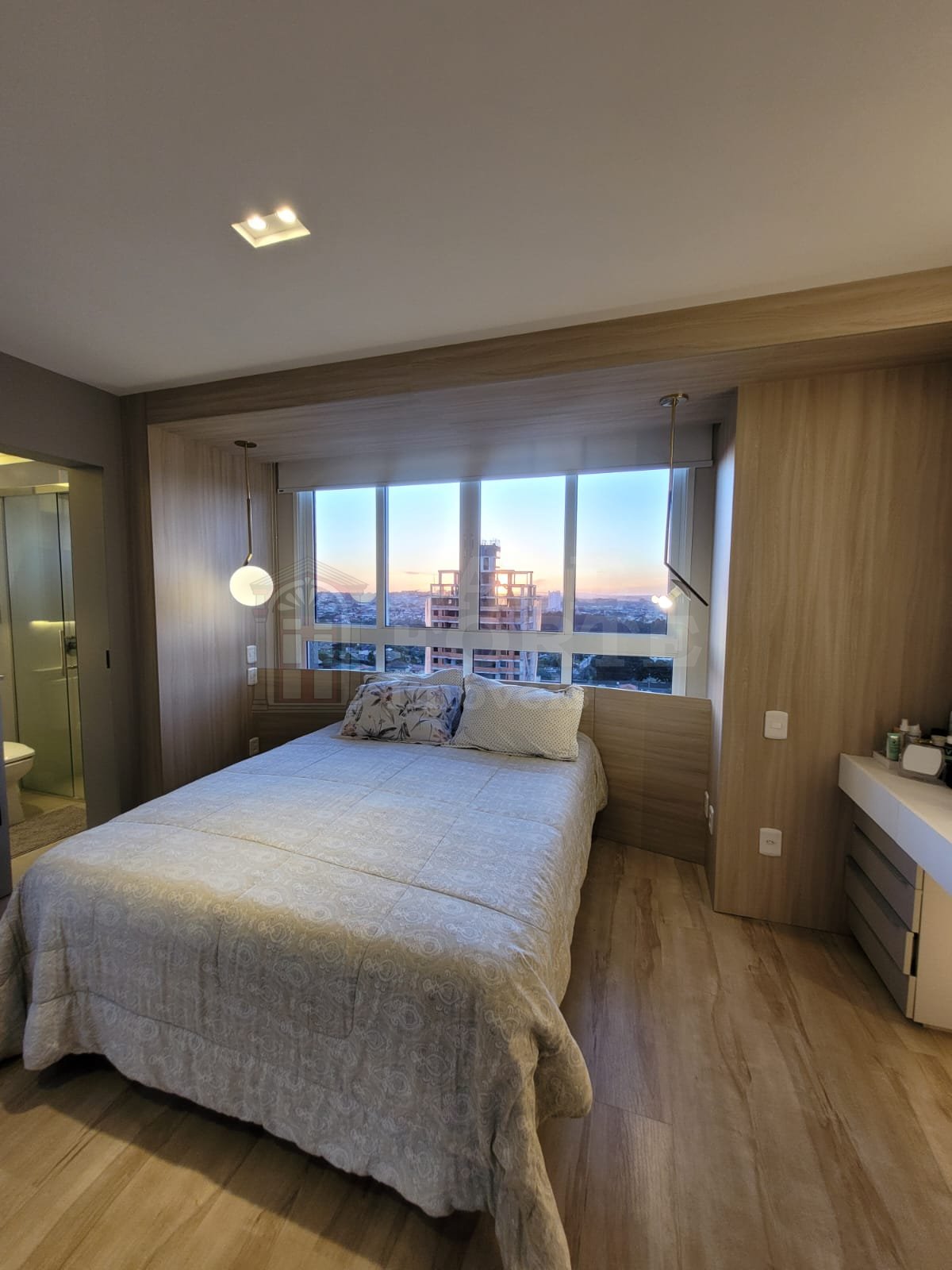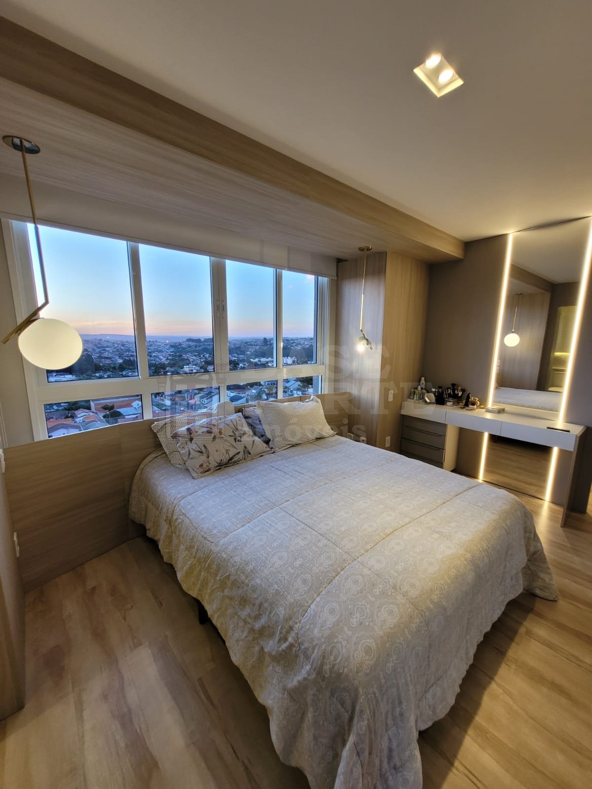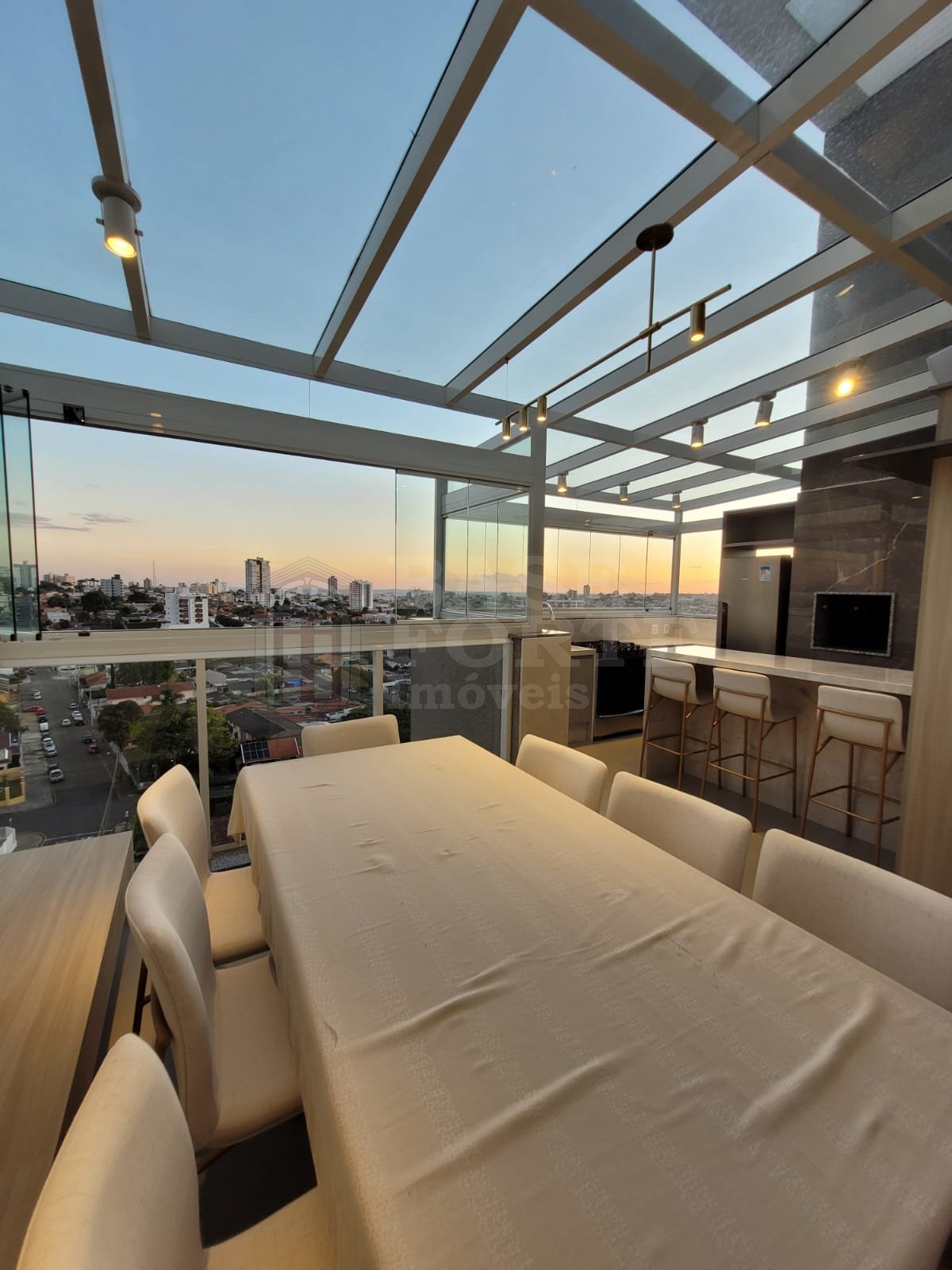 Piso superior - Linda área gourmet em terraço fechado em vidro, com projeto de iluminação e vista privilegiada da cidade; e suíte master com 2 closets.