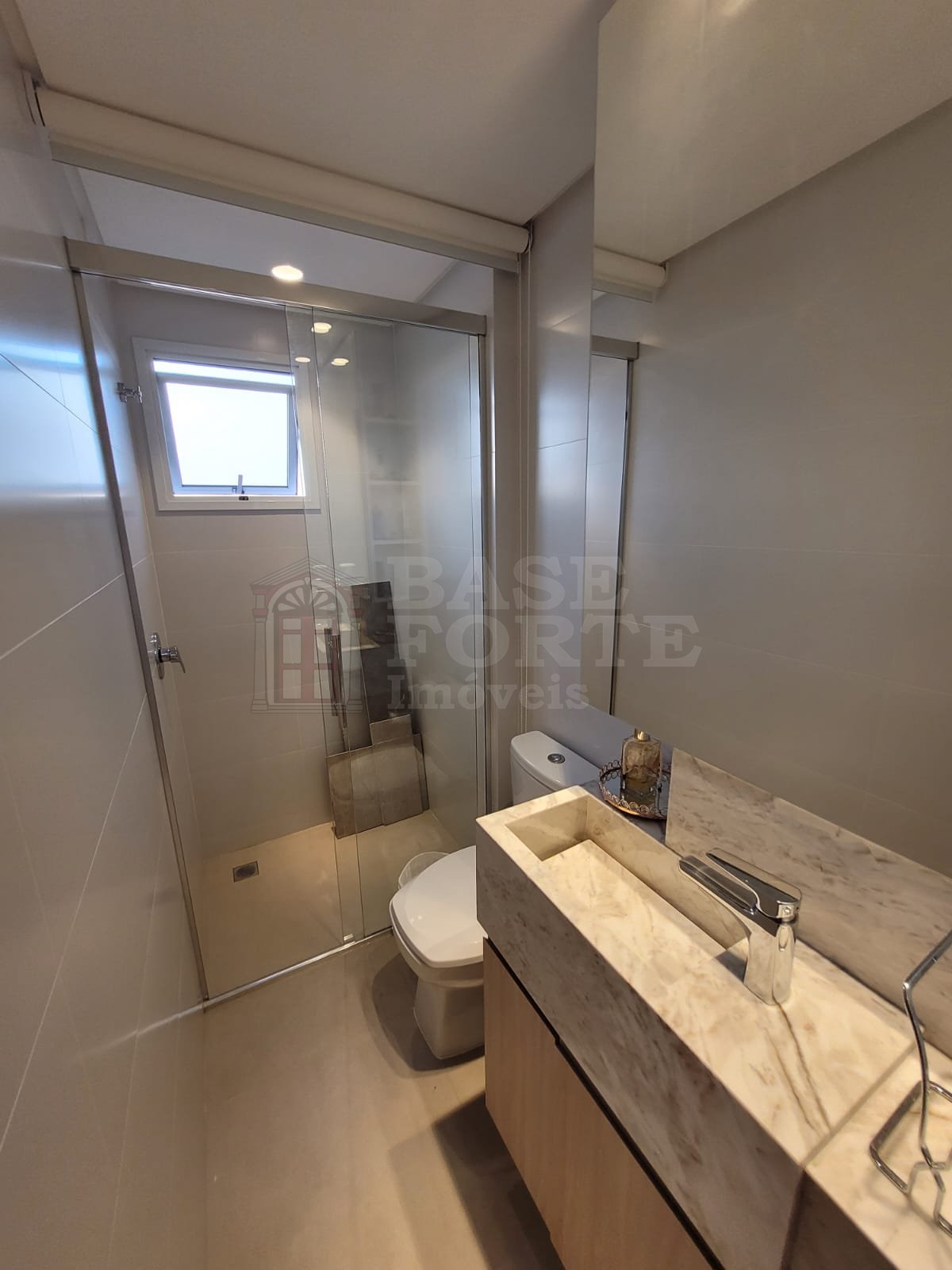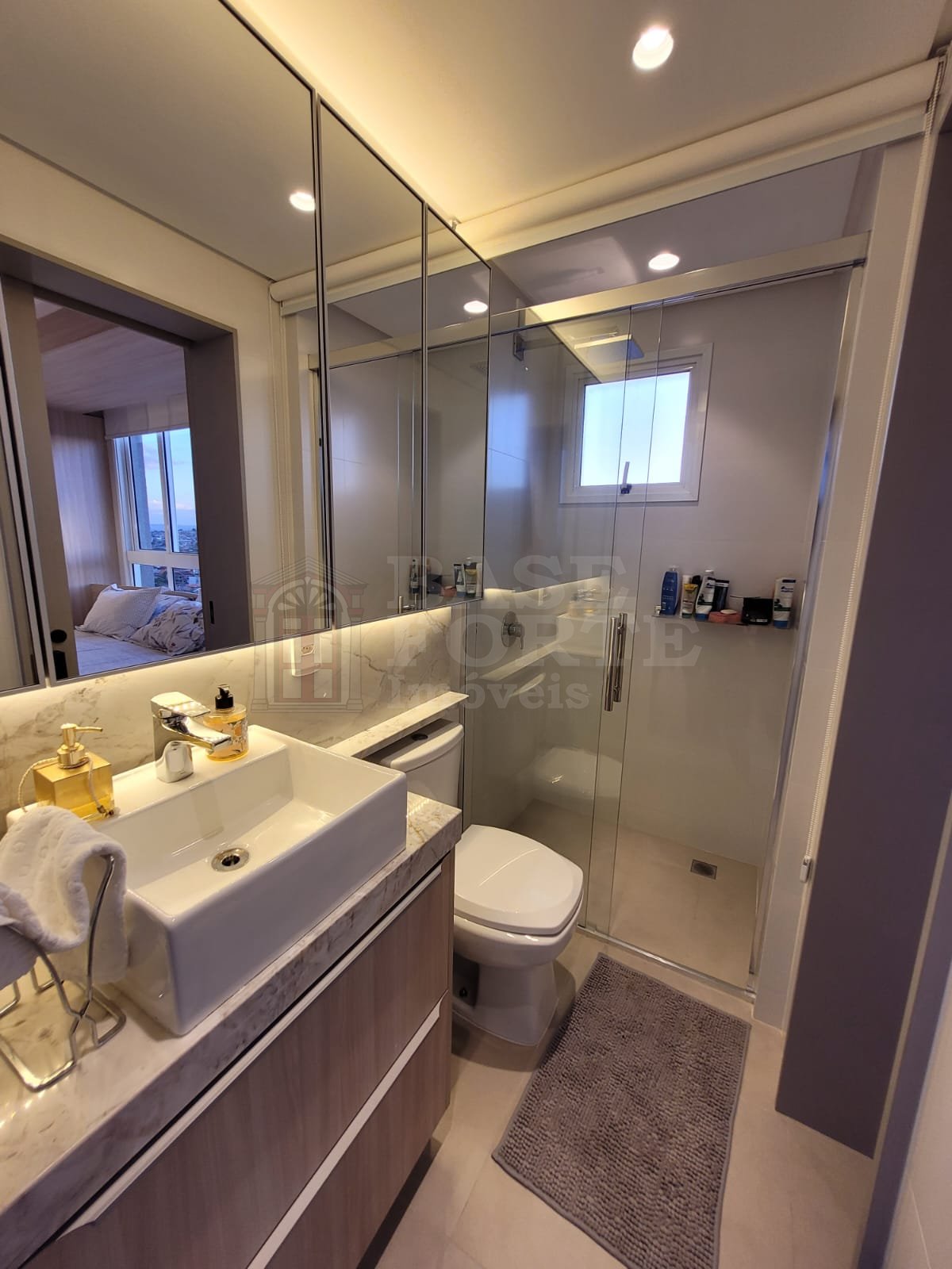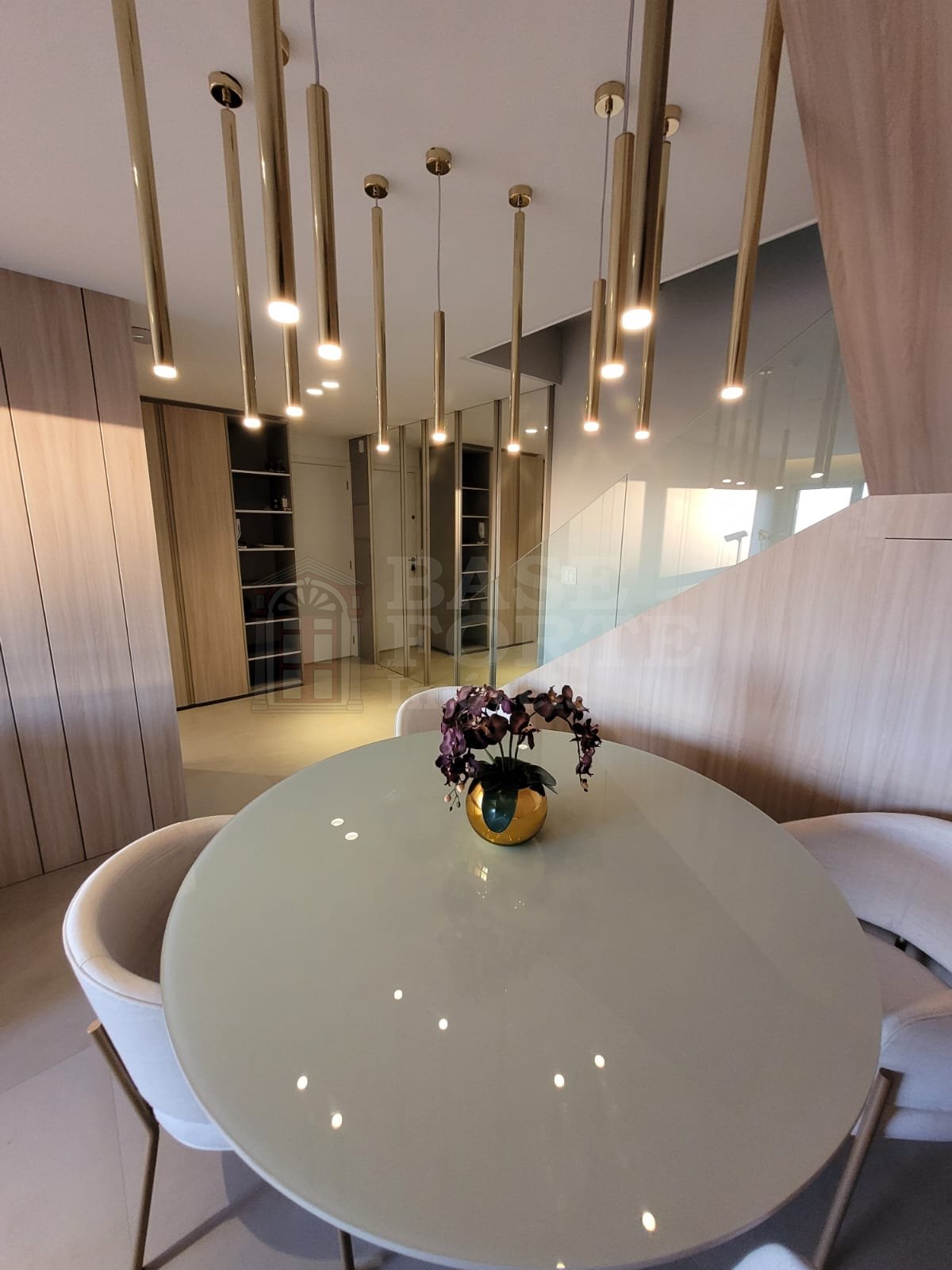 Piso superior - Linda área gourmet em terraço fechado em vidro, com projeto de iluminação e vista privilegiada da cidade; e suíte master com 2 closets.