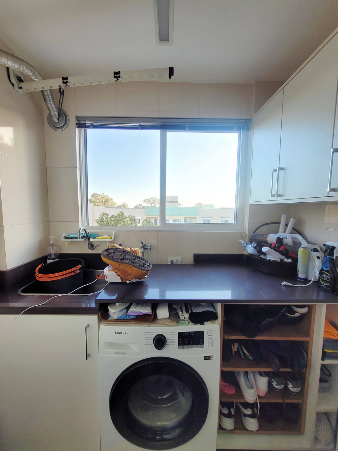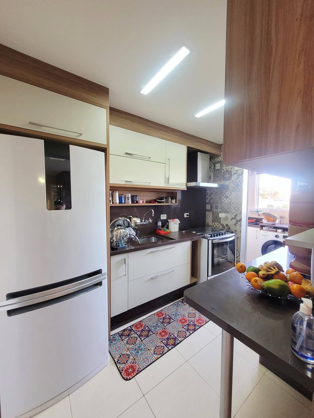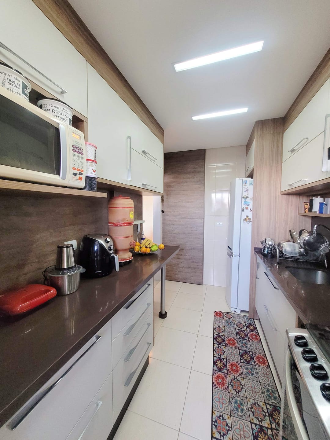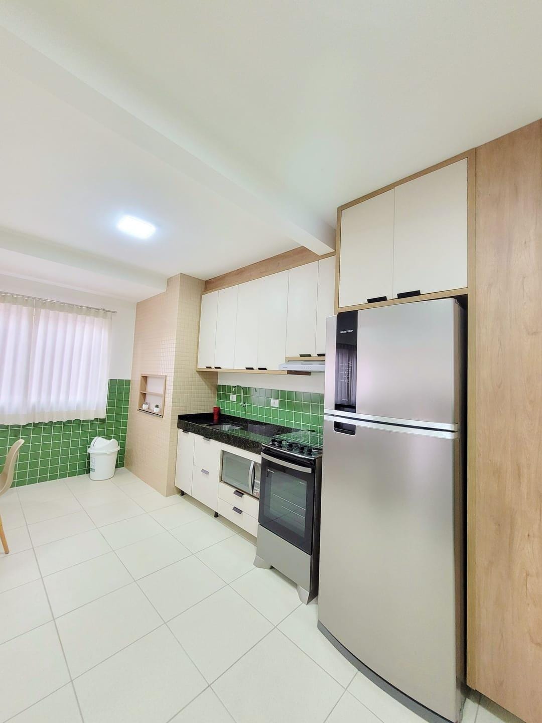 Cozinha mobiliada e também equipada. A área de serviço possui mobília, tanque e aquecedor a gás, de passagem.