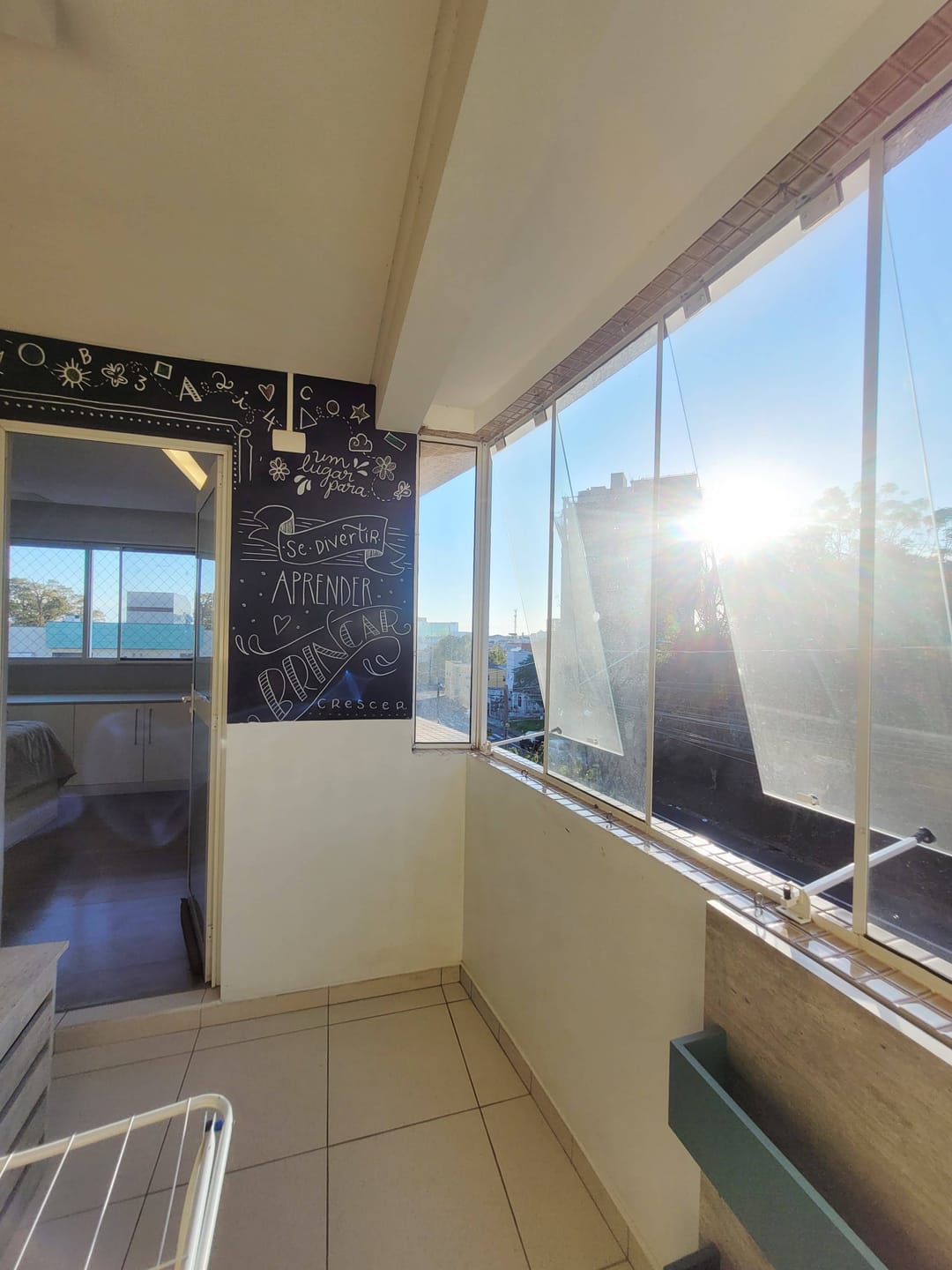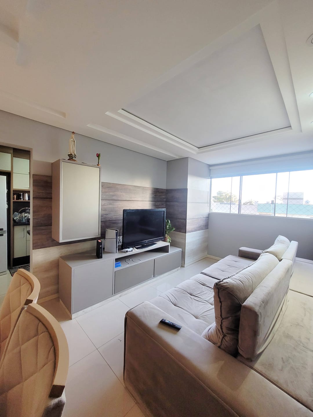 Dispõe de sala de estar e jantar integradas e sacada com churrasqueira à carvão.
